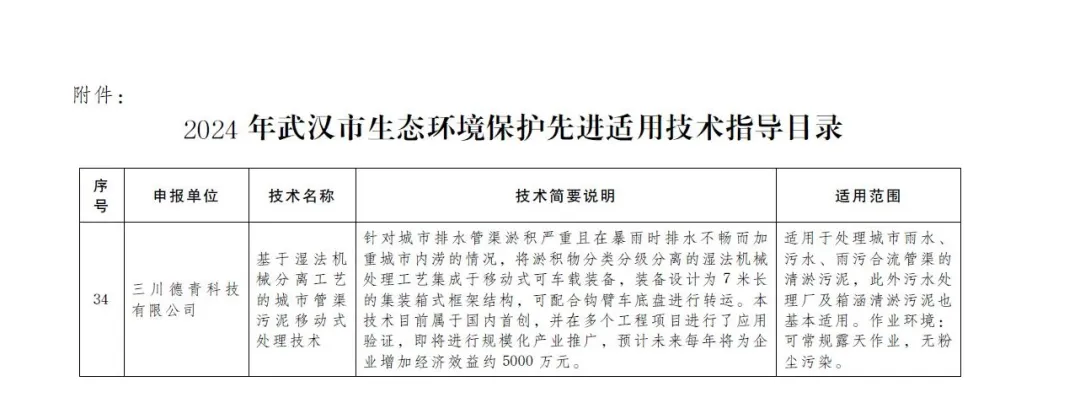 近日,武汉市科学技术局发布了《2024年武汉市生态环境保护先进适用技术指导目录》,开云手机客户端中国有限公司自主研发的“基于湿法机械分离工艺的城市管渠污泥移动式处理技术”成功入选。