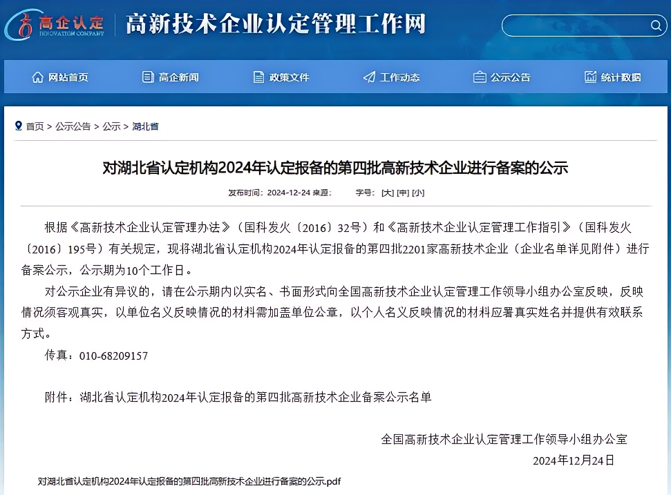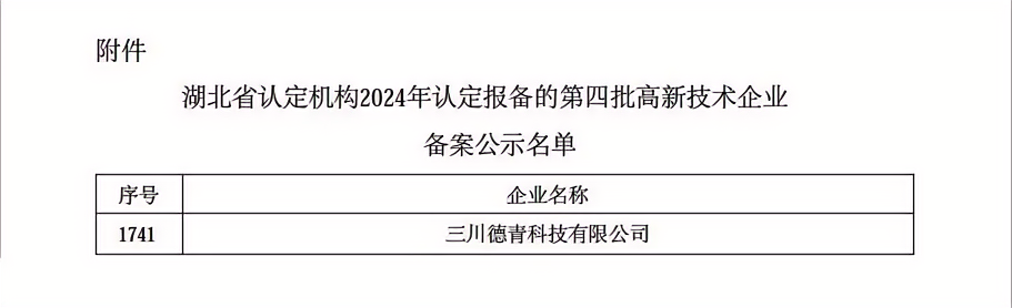 12月24日,全国高新技术企业认定领导小组办公室,正式对外发布了《对湖北省认定机构2024年认定报备的第四批高新技术企业进行备案的公示》的通知文件,三川科技公司通过湖北省第四批高企认定并公示。