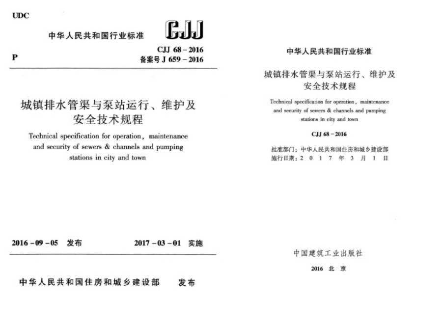 《城镇排水管渠与泵站运行、维护及安全技术规程》现已批准为行业标准,编号为CJJ68-2016,自2017年3月1日起实施。其中,第3.1.4、3.1.5、3.3.4、3.5.11、3.8.7、4.1.2、4.1.7条为强制性条文,必须严格执行。原《城镇排水管渠与泵站维护技术规程》CJJ68-2007同时废止。