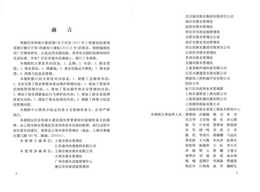 本规程适用于城镇排水管渠与泵站的运行和维护,同时也适用于工业建筑和民用建筑的室外排水管道的运行和维护。本规程是在《城镇排水管渠与泵站维护技术规程》CJJ 68-2007的基础上修订而成,本次修订的主要技术内容是:调整了总则和术语;充实完善了排水管渠和泵站维护管理内容;增加了管渠评估和纳管管理内容;增加了泵站操作和安全管理的内容;增加了雨水调蓄池运行与维护的内容;增加了排水系统调度相关内容;增加了排水防涝的内容;调整了档案与信息化管理内容。