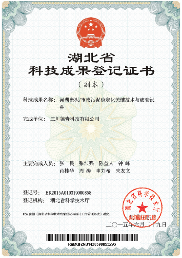 “河湖淤泥/市政污泥稳定化关键技术与成套设备”获得湖北省科技成果登记证书