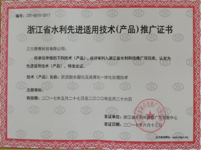 “淤泥脱水固化及资源化利用一体化处理技术”获得浙江省水利先进适用技术推广证书