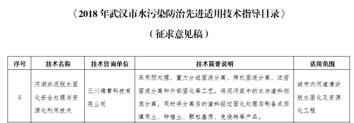“河湖淤泥脱水固化安全处理与资源化利用技术”录入2018年武汉市水污染防治先进适用技术指导目录