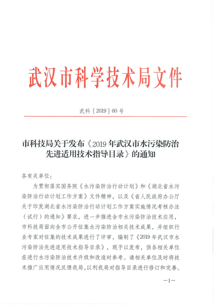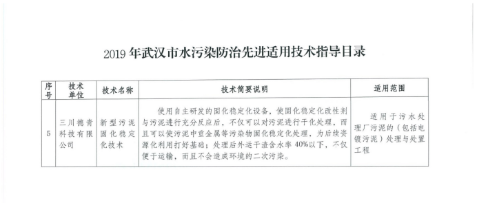 “新型污泥固化稳定化技术”录入2019年武汉市水污染防治先进适用技术指导目录。
