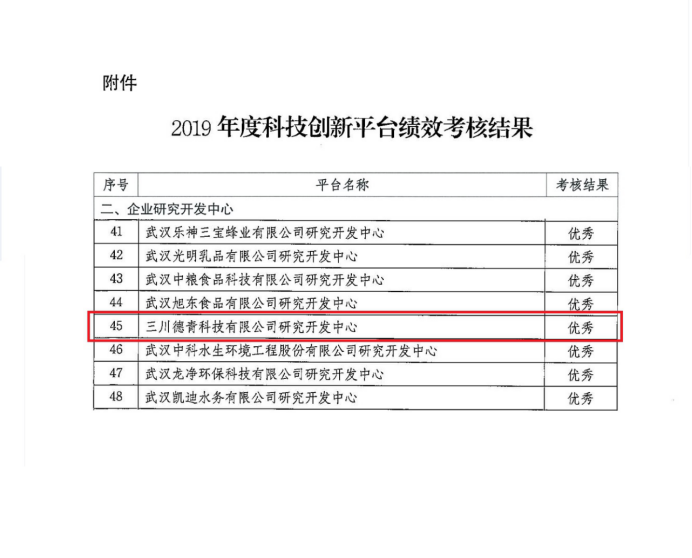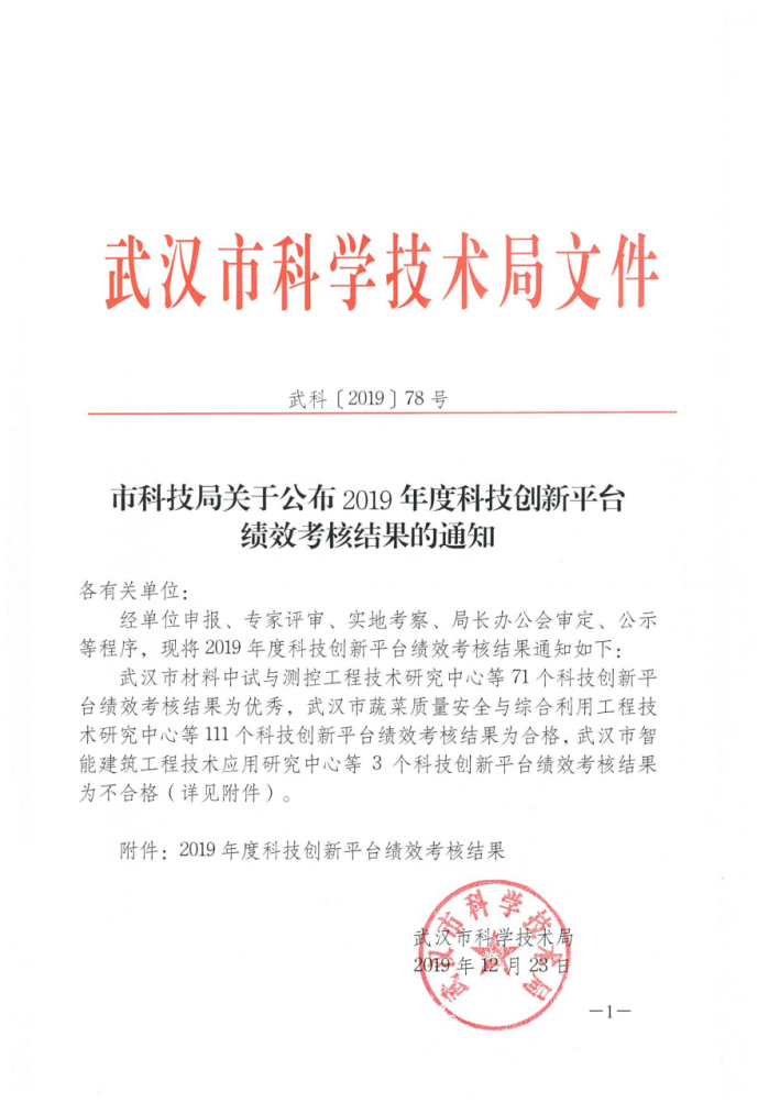 2019年,公司通过武汉市科技局科技创新平台绩效考核,考核结果为优秀。
