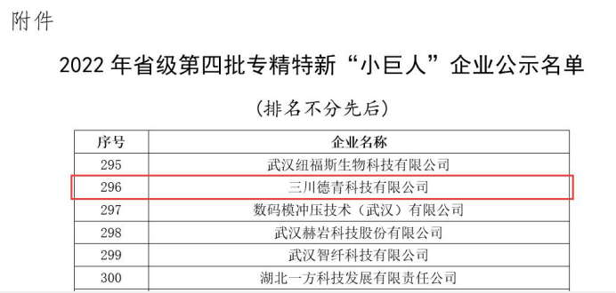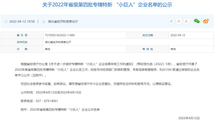 公司凭借在环保领域的自主研发和创新实力成功入选湖北省2022年省级第四批专精特新“小巨人”企业。