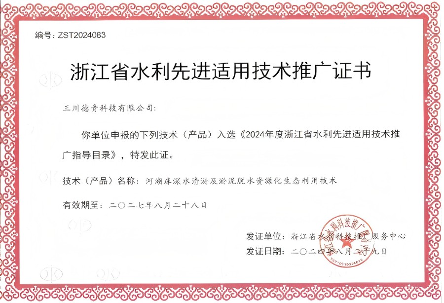 公司自主研发的“河湖库深水清淤及淤泥脱水资源化生态利用技术”成功入选《2024年度浙江省水利先进适用技术推广指导目录》。