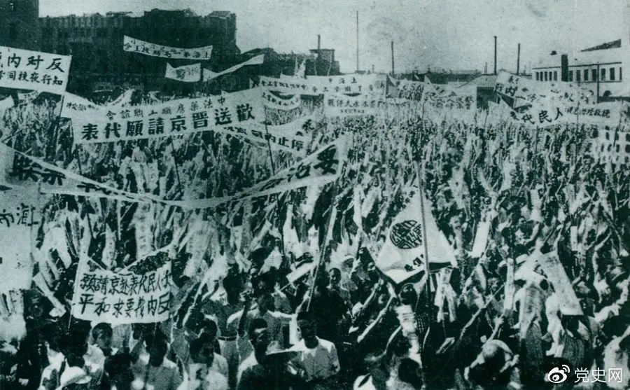 1946年6月23日,上海各界5万余人在北火车站广场召开欢送赴南京请愿代表的大会,呼吁和平,反对内战,并举行了示威游行。