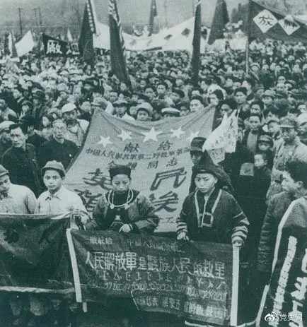 1949年11月15日,贵州解放。图为苗族同胞向人民解放军部队献旗。